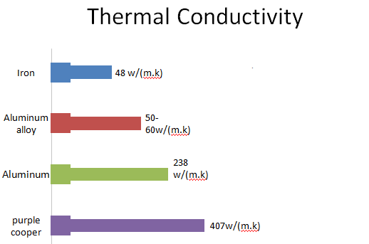 - (2). utilizó el material malo, como aluminio fundido a presión, icono, aluminio recubierto de plástico y plástico. El siguiente diagrama muestra diferentes materiales del cuerpo que tienen diferente conductividad térmica.